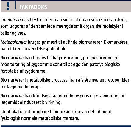 Metabolomstudier kan på forskellig vis bidrage til udviklingen af biologisk og biomedicinsk forskning, og opdagelse af biomarkører er det vigtigste anvendelsesområde [7, 8]. En biomarkør defineres direkte oversat fra Biomarkers Definitions Working Group [9] som: »En karakteristik, som måles objektivt og vurderes som indikator for normale biologiske processer, patologiske processer eller farmakologiske effekter af en terapeutisk intervention«.