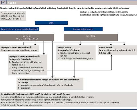 Et udredningsprogram for patienter, der har fået indsat en MoM-hofteprotese (Figur 3), er godkendt af Dansk Ortopædisk Selskab, og opfølgende registrering er godkendt af Danske Regioner. Det overordnede formål med opfølgningsprogrammet er at skabe tryghed hos patienterne efter mediernes dækning af sagen i begyndelsen af 2012 samt at screene for udvikling af pseudotumor og forhøjet ionniveau. Patienter, der har fået indsat en MoM-hofteprotese, skal som udgangspunkt følges med ambulante kontroller efter 1, 2, 5, 7-8 og 10 år. Hyppigere opfølgning end angivet i udredningsprogrammet kan være indiceret ved ændring af symptomer, hævelse, mv. Ved hvert planlagt kontrolbesøg skal der optages sygehistorie, foretages ionmålinger og tages røntgenbilleder af hoften. Udredningen for aseptisk løsning og infektion efter indsættelse af en MoM-hofteprotese adskiller sig ikke fra udredningen ved andre typer hofteproteser. Hvis patienterne har smerter, er de oftest lokaliseret i lysken. De skal have været til stede i mindst én måned og forekomme ca. ét år efter indsættelse af en MoM-hofteprotese. Anden smertelokalisation og tidligere symptomdebut kan dog også afgive indikation for udredning.