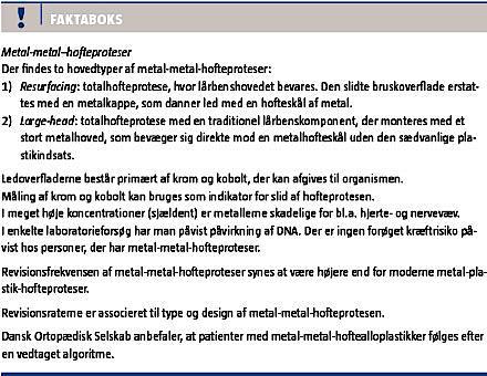 I Danmark indsættes der ca. 10.000 hofteproteser årligt. 20% af de opererede patienter, som er yngre end 55 år, kan forvente at skulle opereres igen i løbet af 10-15 år efter, at de har fået deres første hofteprotese [1]. De hyppigste årsager til revisionerne er fraktur af knoglen omkring protesen, gentagne luksationer, infektion og aseptisk løsning. Patienter med hofteproteser har tidligere været pålagt livslange omfattende bevægerestriktioner og anbefalinger om et moderat aktivitetsniveau for at undgå luksation og nedsætte slid [2]. Metal-metal (MoM)-hofteproteserne blev lanceret som proteser med bedre stabilitet og større slidstyrke [3, 4] end de hidtidige proteser. Samtidig forventede man, at det store metal-hoved gav bedre bevægelse, og at patienterne kunne undgå de tidligere restriktioner.