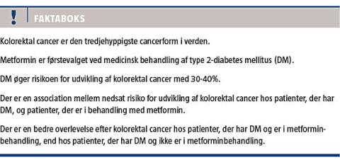 I flere studier har man tidligere påvist, at korttidsmetforminbehandling undertrykker udviklingen af colorectal aberrant crypt foci, som er en surrogatbiomarkør for KRC. I et retrospektivt studie er 3.465 koloskopier blevet opgjort, og forfatterne fandt, at type 2-DM er associeret med en øget risiko for kolorektale adenomer. De patienter, der tog metformin, havde desuden færre kolorektale polypper end de patienter, der havde DM og var i anden behandling [15]. I et igangværende kontrolleret, randomiseret, dobbeltblindet multicenterstudie undersøger man, om metformin har effekt på metakrone kolorektale polypper hos patienter, der ikke har DM. Patienterne eksponeres med 250 mg/døgn metformin vs. placebo i et år og evalueres efterfølgende med koloskopi [16].