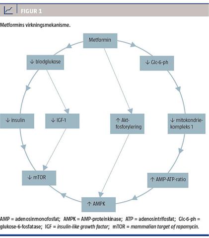Metformins antineoplastiske effekt udøves formentligt via to forskellige mekanismer. Ved at nedsætte insulin- og IGF-1-niveauet i blodet hæmmes mammalian target of rapamycin (mTOR)-pathway, som regulerer cellevækst samt tumorgenese og er associeret med tumorprogression. Foruden de reducerede niveauer af insulin og IGF-1 hæmmes mTOR også via adenosinmonofosfat (AMP)-aktiveret proteinkinase (AMPK). Metformin aktiverer ikke direkte AMPK, men gør det ved at hæmme aktiviteten af glukose-6-fosfatase og hæmmer derved mitokondriekompleks 1, dette medfører en øgning af AMP-adenosintrifosfat-ratioen, hvilket aktiverer AMPK [9] (Figur 1).