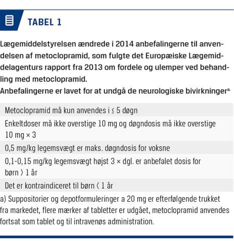 I 2013 ændrede Det Europæiske Lægemiddelagen-tur anbefalingerne for brugen af metoclopramid (Tabel 1). Man må kun anvende metoclopramid i fem dage ad gangen, kumuleret i maksimalt tre måneder. Som ordinerende læge har man pligt til at være opmærksom på mulige neurologiske bivirkninger, som patienten skal informeres om forud for behandlingsstart.