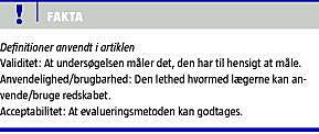 Vi startede med en indholdsvalidering og på baggrund af de relevansscoringer, der blev opnået ved både 1. og 2. udkast, vurderes skemaet som validt. Revisionen i sprog og gruppering af de enkelte udsagn resulterede i en forbedret score for såvel relevans som forståelighed. Vi har ikke testet fo r evalueringens kriterievaliditet - som afklarer, om resultaterne af evalueringen kan sammenholdes med andre måder at indsamle de samme resultater på, eller for begrebsvaliditet - som afdækker, om evalueringsmetoden måler på det, der faktisk formodes at blive målt på. Med andre ord har de, der scorer lavt på evalueringsskemaet også manglende evner inden for området. Da der os bekendt ikke findes nogen guldstandard på området, anser vi det ikke muligt at lave den type valideringer.