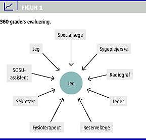 Uddannelsen af speciallæger er baseret på de syv canadiske roller, og disse roller anvendes ligeledes ved overlægebedømmelse. Det synes derfor oplagt at tænke kompetencevurdering af speciallæger ind i samme ramme. Det er praktisk at have redskaber til kompetenceevaluering, som er anvendelige for de fleste typer speciallæger. Kompetencerne, der er relateret til en medicinsk ekspert, er specifikke for de enkelte specialer, mens de øvrige seks kompetencer indeholder fælles elementer for specialerne. Et muligt redskab til vurdering af disse kompetencer er 360-graders-evaluering, på engelsk også multisource feedback . Metoden er de senere år anvendt som kompetencevurdering i speciallægeuddannelsen i Danmark [5]. Inden for andre brancher end den sundhedsprofessionelle har metoden en langt større udbredelse, f.eks. i erhvervslivet som et praktisk redskab til at vurdere kompetence på arbejdspladsen [6]. Både i USA og Canada har man udviklet 360-graders-skemaer til løbende certificering af speciallæger [7-9]. Metoden går ud på, at den person, der skal vurderes, selv udvælger en gruppe samarbejdspartnere, som udfylder et standardiseret spørgeskema. Samarbejdspartnerne og personen selv skal vurdere, i hvor høj grad han eller hun er i besiddelse af de beskrevne kompetencer (Figur 1 ). I flere af de udenlandske modeller indgår også patienter som en gruppe, der skal evaluere speciallægen [7, 8].