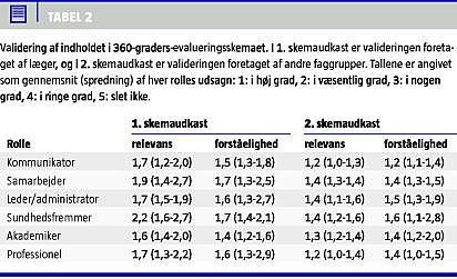 Efter ovenstående kriterier blev et endeligt 360-graders-evalueringsskema lavet (Tabel 1 ). Forud for det endelige skema blev alle indkomne forslag til sproglige omformuleringer, eventuelle mangler, relevans- og forståelsesscoringer omhyggeligt vurderet af forfattergruppen. Herefter blev alle afdelingsledelser på hospitalet tilbudt, at to speciallæger kunne deltage i en pilotundersøgelse. Ved denne skulle speciallægerne dels evaluere sig selv, dels 360-graders-evalueres af deres samarbejdspartnere. Skemaet blev elektronisk formuleret. Speciallægerne blev bedt om at indsende navne og e-mail-adresser på 15 samarbejdspartnere, som de på forhånd havde sikret sig gerne ville deltage. De blev opfordret til at udvælge 50% læger fra forskellige uddannelsesniveauer og 50% fra andre faggrupper (sygeplejersker, jordemødre, sekretærer, radiografer, bioanalytikere etc.). De, som skulle evaluere speciallægerne, fik tilsendt og svarede på det elektroniske 360-graders-skema via e-mail. Der blev genereret en elektronisk rapport til hver speciallæge med resultaterne i anonymiseret form.