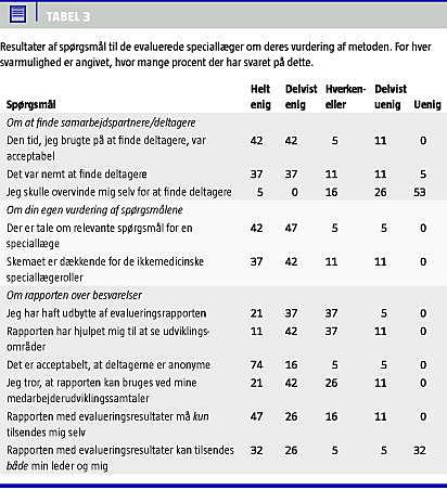 Tilbud om deltagelse i pilottesten i speciallægegruppen blev sendt til 17 ledende overlæger på hospitalet. Fra 11 afdelinger blev der tilmeldt 23 speciallæger. Blandt de tilmeldte deltagere indsendte 18 speciallæger (78%) navne og e-mail-adresser på samarbejdspartnere, som skulle deltage. Samarbejdspartnerne var 141 læger og 125 fra andre faggrupper. Besvarelsesprocenten på selve 360-graders-evalueringsskemaet var blandt de speciallæger, som selv skulle evalueres 100%, blandt de evaluerende læger 82% og blandt de andre faggrupper 83%. I gennemsnit blev hver speciallæge således evalueret af 14 personer (sig selv, 6,4 andre læger og 5,9 fra andre faggrupper) med en variation mellem 11 og 16. For alle udsagn var der et antal personer, som ikke så sig i stand til at vurdere den enkelte speciallæge; for lægerne gjaldt dette i gennemsnit for 17% af udsagnene, med en variation mellem 0 og 46% og for andre fagpersoner 20%, med en variation på mellem 0 og 55%. Det efterfølgende vurderingsskema blev besvaret af alle evaluerede speciallæger. Resultaterne fremgår af Tabel 3 . Som det fremgår, var det ikke svært at finde samarbejdspartnere til evalueringen. Speciallægerne fandt i høj grad, at der var tale om relevante spørgsmål, som var dækkende for de ikkemedicinske roller. Om selve rapporten var 58% helt eller delvist enige i, at de havde udbytte af den, og 55% mente, at den havde hjulpet dem til at se udviklingsmuligheder. Ni ud af ti var helt eller delvist enige i, at anonymitet var acceptabelt. På spørgsmålet om, hvorvidt speciallægerne mente, at rapporten kan bruges ved en medarbejderudviklingssamtale (MUS), var 63% helt enige eller delvist enige, og ingen var helt uenige. Vedrørende hvem, der skal have resultaterne af 360-graders-evalueringsrapporten tilsendt, var 47% helt enige i og 26% delvist enige i, at det kun var medarbejderen selv. Til forslaget om at rapporten kunne tilsendes både lederen og den evaluerede selv, var 32% helt uenige og 26% delvist uenige.