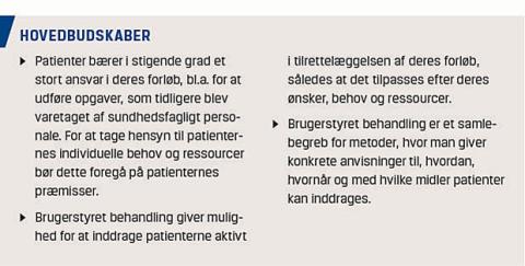 I denne artikel gøres der status over brugerstyret behandling, og metodens brug i praksis beskrives. Den er primært baseret på erfaringer fra projektet »Det brugerinddragende hospital«, hvor 18 afdelinger på Aarhus Universitetshospital arbejder med metoderne fælles beslutningstagning og brugerstyret behandling i udvalgte patientforløb. Brugerstyret behandling findes endnu ikke som et særligt forskningsfelt, og studier af implementering og effekt er sparsomme.