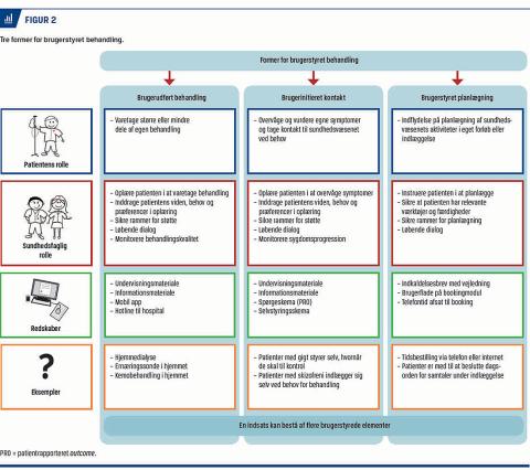 at tydeliggøre måder, hvorpå brugerstyring kan forekomme i forskellige patientforløb (Figur 2). Ved brugerstyret behandling er patientens vurdering af sin tilstand (delvist) styrende for behandlingen og kontakten med sundhedsvæsenet. I praksis vil et brugerstyret tilbud ofte omfatte flere brugerstyrede elementer.