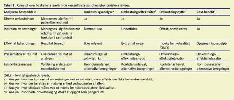Er man er nået så vidt, kan resultatet præsenteres som ratio mellem prisen for interventionen og QALY. Men spørgsmålet er imidlertid, hvornår er en intervention for dyr? En tommelfingerregel er, at ca. 300.000 kr./QALY er den øvre grænse, således at der kræves særlige grunde til, at en intervention dyrere end dette alligevel accepteres. I Tabel 1 er forskellen på hyppigt anvendte sundhedsanalysemodeller præsenteret.