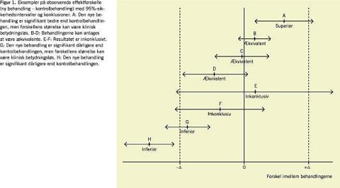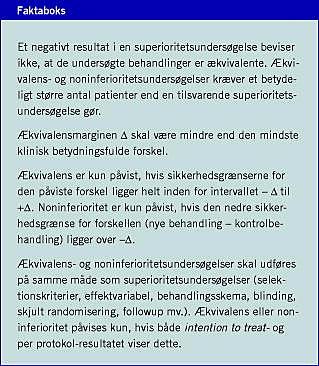 Den randomiserede kliniske undersøgelse (randomized clinical trial (RCT)) anses for at være den bedste metode til sammenligning af behandlingers effekt [1]. En RCT er hyppigst designet til at vise, at en ny behandling er bedre end en etableret behandling eller placebo, dvs. den er planlagt og udført som en superioritetsundersøgelse. Somme tider er formålet med en RCT blot at vise, at en ny behandling er lige så god eller i det mindste ikke dårligere end en etableret behandling, dvs. den er planlagt og udført som en ækvivalensundersøgelse eller noninferioritetsundersøgelse. Da de forskellige typer RCT har forskelligt formål, afviger de fra hinanden med hensyn til metodologiske forhold. Denne artikel gennemgår kortfattet de vigtigste metodologiske forskelle. I denne sammenhæng vil de vigtigste relevante statistiske begreber blive beskrevet. Der henvises til [2] for en detaljeret gennemgang med eksempler på beregning af materialestørrelse og konfidensintervaller.