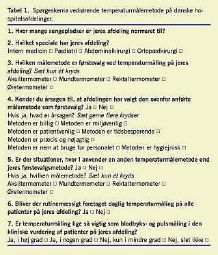 Ved den primære vurdering af patientens kliniske tilstand anvendes der en række simple metoder som måling af puls, blodtryk, iltmætning i blodet og temperatur. Resultatet af disse målinger kan påvirke den videre behandling, hvorfor det er vigtigt, at disse målemetoder er pålidelige. Der er ikke tidligere gennemført undersøgelser, hvori man belyser, hvilke metoder der anvendes som førstevalg til måling af temperatur på patienter, der er indlagt på danske hospitaler. Formålet med dette studie er at undersøge, hvilke metoder der anvendes som førstevalg ved klinisk måling af temperatur på hospitalsafdelinger i Danmark.