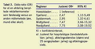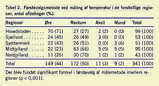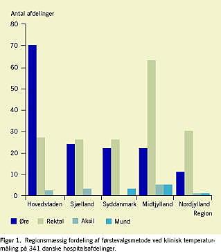 Konklusion: Vores resultater afspejler manglende konsensus om valg af metode til den daglige kliniske måling af temperatur på danske hospitalsafdelinger. Der er væsentlige forskelle imellem regioner og specialer i valg af metode. Der synes at være en øst-vest-gradient, således at øremåling blev foretrukket i hovedstadsområdet og Sjælland, mens rektalmåling blev foretrukket i Jylland.