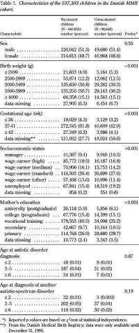 Tabel 1 viser kohorten opdelt efter vaccinationsstatus, køn, fødselsvægt, gestationsalder, socioøkonomisk status for familien, moderens uddannelse og barnets alder ved diagnosticeringen. Gennemsnitsalderen ved diagnosetidspunktet var fire år og tre måneder for infantile autister, mens gennemsnitsalderen for børn med andre udviklingsforstyrrelser i det autistiske spektrum var fem år og tre måneder. Den gennemsnitlige alder ved MFR-vaccinationen var 17 måneder, og 98,5% af børnene blev vaccineret inden treårsalderen. Der var ingen kønsforskel i tilslutningen til MFR-vaccinationen.