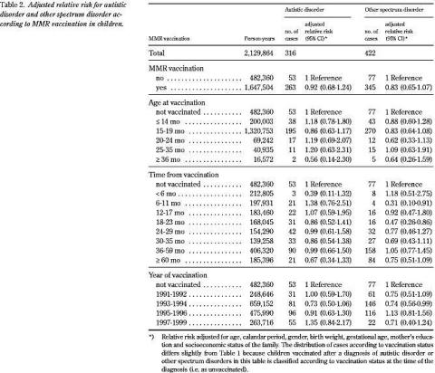 Summary A population-based study of measles, mumps, and rubella vaccination and autism. Ugeskr Læger 2002; 164: 5741-4. Introduction: It has been suggested that the measles-mumps-rubella (MMR) vaccination causes autism. Material and methods: We conducted a retrospective cohort study of all children born in Denmark from January 1991 through December 1998. The cohort was established based on data from the Danish Civil Registration System. A unique person identifiable number given to all subjects enabled linkage with other national registries. MMR vaccination status was obtained from the Danish National Board of Health. Information on the children's autism status was obtained from the Danish Psychiatric Central Register which contains information on all diagnoses received from psychiatric hospitals, psychiatric wards, and outpatient clinics in Denmark. We obtained information on potential confounders from the Danish Medical Birth Registry, the National Hospital Registry, and Statistics Denmark. Results: In the cohort of 537,303 children (2,129,864 person-years), 440,655 children had been MMR vaccinated. We identified 316 children with a diagnosis of autistic disorder and 442 with a diagnosis of other spectrum disorders. After adjusting for potential confounders, the risk for autistic disorder and other spectrum disorders was not increased in vaccinated compared with unvaccinated children (relative risk 0.92; 95 percent confidence interval, 0.68 to 1.24 and relative risk 0.83; 95 percent confidence interval, 0.65 to 1.07). There was no association between age at vaccination, time since vaccination or calendar period at time of vaccination and development of autistic disorder. Discussion: This study provides strong evidence against the hypothesis that MMR vaccination causes autism.