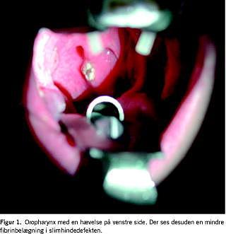 En 30-årig mand blev indlagt via egen læge under diagnosen retrofaryngeal absces obs. Patienten klagede over kraftige svælgsmerter gennem 2-3 dage, ikke kun i hvile, men specielt ved synkning. Patienten havde desuden været subfebril i hjemmet. Egen læge fandt ved objektiv undersøgelse asymmetri på svælgets bagvæg, og patienten blev henvist telefonisk til vurdering på Rigshospitalets Øre-, næse-, hoved- og halskirurgiske Klinik F. Ved en ny undersøgelse genfandt man asymmetrien i form af hævelse i venstre side af oropharynx og defekt i slimhinden, hvorfor patienten blev indlagt på mistanke om retrofaryngeal absces med spontan perforation. Der var, fraset venstresidig mikroadenitis på halsen, normale forhold i øre, næse og hals i øvrigt.
