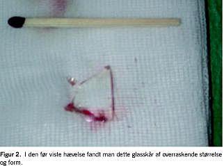 Senere samme døgn lagde man patienten i generel anæstesi med henblik på regelret incision og drænage af absceskaviteten. Der blev placeret en standard Boyle-Davis-gag, og oropharynx blev inspiceret. Her så man i patientens venstre side en hævelse på ca. 3 × 2 × 1 cm med defekt slimhinde i et område, der var få millimeter i diameter (Figur 1 ). Palpatorisk forsøgtes eksprimering af pus, men hævelsen var fast af konsistens og uden fluktuation. Samtidig fremkom hjørnet af et fremmedlegeme i defekten. Fremmedlegemet fattedes med péan , og defekten blev udvidet med en skalpel, således at fremmedlegemet kunne fjernes in toto fra kaviteten. Det viste sig, at der var tale om et glasskår af overraskende størrelse (Figur 2 ), skarpt på alle fire kanter, men i øvrigt uden særlige kendetegn. Kaviteten blev gennemgået uden yderligere fund og blev i øvrigt efterladt åben for at undgå sekundær infektion. Der var ingen peroperativ blødning og intet pus i kaviteten. Operationen afsluttedes uden yderligere tiltag.