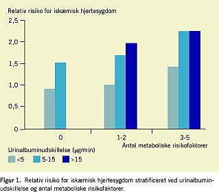 Mens diabetologer for længst har implementeret mikroalbuminuri i den daglige klinik, er betydningen af mikroalbuminuri som en uafhængig prædiktor for iskæmisk hjertesygdom hos personer uden diabetes langt mindre accepteret blandt andre klinikere som kardiologer, internmedicinere og almen medicinere. Dette skyldes måske manglen på interventionsundersøgelser af personer uden diabetes. Men den kliniske værdi af mikroalbuminuri til stratificering af risikoen for iskæmisk hjertesygdom blev yderligere underbygget i en analyse foretaget i Østerbroundersøgelsen: Den prædiktive effekt af mikroalbuminuri blev sammenlignet med den prædiktive effekt af det metaboliske syndrom for udvikling af iskæmisk hjertesygdom. Det metaboliske syndrom blev defineret i henhold til the National Cholesterol Education Program Adult Treatment Panel III (NCEPATP III) med mindre modifikationer ved tilstedeværelse af mindst tre af følgende fem komponenter: 1) adipositas, 2) hypertension, 3) diabetes eller nedsat glukosetolerans, 4) forhøjet triglycerid og 5) lav højdensitetslipoproteinkolesterol. Analyserne viste, at en urinalbuminudskillelse på over 5 μ g pr. minut er associeret med øget risiko for iskæmisk hjertesygdom til samme niveau som det metaboliske syndrom (Figur 1 ). Overraskende nok er tilstedeværelse en urinalbuminudskillelse over kun 5 μ g pr. minut således forbundet med samme risiko for iskæmisk hjertesygdom som tilstedeværelse af 3-5 veletablerede risikofaktorer for iskæmisk hjertesygdom. Siden der også er konstateret er stærk sammenhæng mellem antallet af komponenter i det metaboliske syndrom og urinalbuminudskillelse, har the World Health Organisation (WHO) for nylig besluttet at inkludere mikroalbuminuri i definitionen af det metaboliske syndrom. Det er ikke utænkeligt, at en reduktion i de metaboliske risikofaktorer f.eks. ved vægttab eller brug af antihypertensiva og lipidsænkende farmaka reducerer albuminudskillelsen i urinen.
