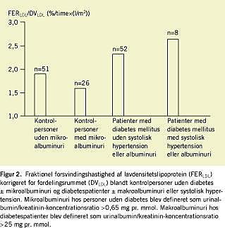 Flere hypoteser har været fremsat til forklaring af den patofysiologiske sammenhæng mellem mikroalbuminuri og aterosklerose. En mulig hypotese er, at mikroalbuminuri er associeret med systemisk transvaskulær lækage af makromolekyler inklusive lipoproteiner, hvilket kunne føre til lipidakkumulation i karvæggen. For at undersøge om mikroalbuminuri er associeret med systemisk transvaskulær lækage af albumin, måltes den fraktionelle forsvindingshastighed (FERalbumin ) af radioaktivt, jod-125-mærket albumin fra det intravaskulære rum i en time efter intravenøs injektion. Klinisk raske personer med mikroalbuminuri havde øget FERalbumin til samme niveau som patienter med svær aterosklerose [5, 6]. For yderligere at teste ovennævnte hypotese udvikledes dernæst en metode til måling af den fraktionelle forsvindingshastighed af lavdensitetslipoprotein (FERLDL ) [7]. I modsætning til radioaktivt mærket albumin, som er kommercielt tilgængeligt til intravenøs injektion, må LDL isoleres fra hver enkelt forsøgsperson og dernæst joderes, før intravenøs reinjektion kan foretages. Sundhedsmyndighederne tillod, at der blev undersøgt to forsøgspersoner om ugen efter følgende skema: dag 1: blodprøvetagning; dag 1-2: LDL (densitet 1,019-1,050 g/ml) blev isoleret ved sekventiel ultracentrifugering i 2 × 18 timer; dag 3: LDL-partiklerne blev radioaktivt mærket med jod-131; dag 4: Det autologe 131 I-LDL blev reinjiceret intravenøst, og blodprøver blev taget hvert tiende minut i den følgende time; dag 4-5: radioaktiviteten i plasmaprøverne blev talt i en gammatæller, o g FERLDL blev beregnet ved den fraktionelle faldhastighed i radioaktivitet gennem en time efter reinjektion. Det var dog ikke muligt at finde en association mellem mikroalbuminuri og FERLDL hos personer uden diabetes [8]. Derimod var FERLDL klart forhøjet hos patienter med diabetes, og dette var særlig udtalt, hvis senkomplikationer som makroalbuminuri eller hypertension var til stede [9] (Figur 2 ).