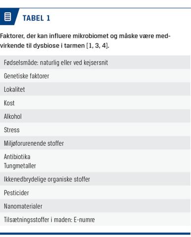 Mange af de faktorer, der kan påvirke mikrobiomet (Tabel 1), kan potentielt også medføre dysbiose. Et stort antal stoffer (E-numre [4]) er tilladt for at »forbedre« levnedsmidlernes smag, farve, konsistens og holdbarhed, men disse stoffers virkning på mikrobiomet var ikke kendt på godkendelsestidspunktet og kendes fortsat ikke.