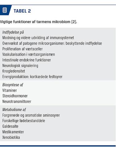 I Tabel 2 gives en summarisk oversigt over de vigtigste funktioner, som tarmens mikrobiom har for værtsorganismen [1]. Af kroppens makrofager er 80% lokaliseret i leveren, som derfor er en vigtig barriere mod indtrængende bakterier og deres produkter fra tarmen [5].