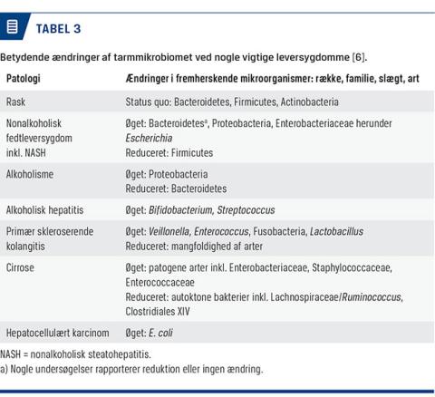 Ved cirrose, som er slutstadiet af kronisk leversygdom, er der også fundet dysbiose (Tabel 3). Flere intestinale faktorer bidrager til udviklingen af cirrose, herunder lækage af tarmbakterier og deres produkter gennem tarmepitelet med portalblodet til leveren, hvor der udløses et kraftigt immunrespons.