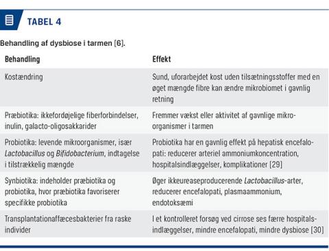 I Tabel 4 gives der en oversigt over de behandlinger, der menes at have en gavnlig effekt mht. at revertere dysbiosen og genskabe et sundt mikrobiom. I mange tilfælde vil det være naturligt at forsøge effekten af en sund, uforarbejdet, overvejende plantebaseret kost med en tilstrækkelig mængde fibre og uden tilsætningsstoffer, evt. i kombination med probiotika. Probiotika har vist sig at have en gavnlig effekt ved hepatisk encefalopati [29] (Tabel 4). Præbiotika og synbiotika kan evt. forsøges, men der er brug for flere undersøgelser, før deres plads i behandlingen kan fastlægges.