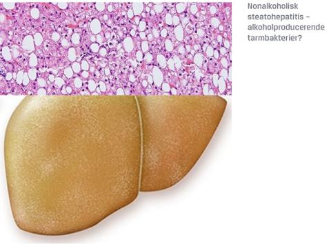 Nonalkoholisk steatohepatitis (NASH), der karakteriseres af metabolisk syndrom, hepatisk steatose og leverinflammation, er en tiltagende hyppig leversygdom, specielt i USA. Ved denne sygdom er der påvist varierende grader af dysbiose (Tabel 3) [6]. Af særlig interesse er påvisning af en øget forekomst af alkoholproducerende bakterier (Escherichia) i tarmen samt forhøjede alkoholkoncentrationer hos børn og unge med NASH [7]. Selv om disse fund ikke er blevet bekræftet i andre undersøgelser [8], har det været muligt at fremsætte en hypotese, der forener de forskellige resultater, om, at NASH i betydeligt omfang skyldes endogen produktion af alkohol i tarmbakterier og i realiteten er en endogen alkoholisk fedtleversygdom [9]. Argumenterne herfor er: 1) Der er histopatologiske lighedspunkter imellem NASH og alkoholisk leversygdom, 2) alkohol produceret af tarmbakterierne omdannes allerede i et vist omfang i tarmen (af tarmbakterier) til acetaldehyd, således at alkohol ikke nødvendigvis kan påvises i blodet, 3) ekstrahepatisk acetaldehyd dannet i tarmen er meget mere hepatotoksisk end det i leveren dannede acetaldehyd, der metaboliseres næsten udelukkende i leverens mitokondrier, 4) tarmbakterier kan producere alkohol i en meget større mængde end den, der anses for nødvendig for at fremkalde cirrose hos mennesket, 5) alle de gener, der er involveret i metabolismen af endogent alkohol, er opreguleret i NASH-leveren, og 6) alkoholdehydrogenase 4 er markant opreguleret i leveren, hvilket tyder på, at leveren udsættes for alkohol i betydeligt omfang ved NASH.