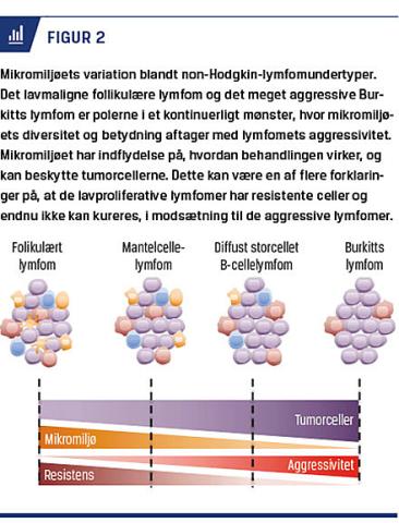 Både i FL og DLBCL har man ved genekspressionsprofilering (GEP) fundet prognostisk betydende signaturer, som stammer fra mikromiljøet [19, 20]. Man har siden forsket i de enkelte cellers prognostiske betydning, og selvom der er enkelte tendenser, er der generelt ikke konsensus om, hvilke udfald cellerne prædikterer. Forskelle i behandling af de forskellige kohorter lader til