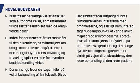Kræft kan ikke længere betragtes som isolerede celler på afveje, men skal ses som helhed i samspil med de celler, der udgør miljøet omkring kræftcellerne. I denne artikel vil vi redegøre for vores nuværende viden om mikromiljøets betydning for de hyppigste B-celle-non-Hodgkin-lymfomer (B-NHL), samt hvilken rolle de enkelte celletyper spiller, enten som med- eller modspillere, i kampen mod lymfekræft.
