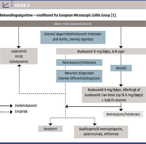 Før anden medicinsk behandling iværksættes, skal patientens lægemiddelforbrug gennemgås, og eventuel behandling med nonsteroide antiinflammatoriske stoffer skal stoppes. Rygestop må tilrådes. Budesonid er den eneste behandling af MC, hvor man har påvist dokumenteret effekt i placebokontrollerede studier [1, 2, 15]. I et dansk kontrolleret studie blev der påvist effekt af budesonid ved CC [16]. Behandling med budesonid i 8-12 uger normaliserede afføringsmønsteret og reducerede de histologiske forandringer. I en efterfølgende Cochraneanalyse blev der fundet god dokumentation for effekten af budesonid, og behandlingen må i dag anses for at være standardbehandling ved svær CC. Der foreligger en enkelt placebokontrolleret undersøgelse, hvor man ligeledes har påvist effekt af budesonid ved LC [2, 15]. Behandlingsstrategien ved LC er derfor den samme som ved CC. Den optimale dosering af budesonid er ikke undersøgt. Sædvanlig behandling er 9 mg givet én gang dagligt i fire uger. Hvis patienten er i remission nedtrappes til 6 mg én gang dagligt i 2-4 uger; herefter 3 mg én gang dagligt i 2-4 uger. Herefter tilrådes forsøg på seponering. Budesonid er effektiv hos 80-90% af patienterne med MC, og flertallet af de behandlede opnår normalisering af afføringen inden for to uger. Ved behandlingssvigt skal anden årsag til diarréen overvejes. Nyere undersøgelser har vist en stor risiko for recidiv ved behandlingsophør [1, 2]. Selv efter 24 ugers budesonidbehandling blev der observeret recidiv af symptomerne hos 80% af patienterne efter behandlingsophør [17]. Nogle af disse patienter havde behov for langtidsbehandling med budesonid i den mindste dosis, der kan fastholde remission, mens andre fik repeterende behandlinger. Risikoen for bivirkninger ved længerevarende behandling med 3 mg budesonid dagligt er uafklaret, men anses for at være beskeden. Flere patienter får dog mindre suggilationer. Supplerende behandling med calcium og D-vitamin anbefales.