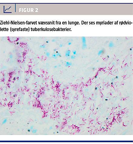 Tuberkulosebakterier kan i princippet infiltrere og påvirke alle organsystemer, hvorfor symptomvariationen ved MTB er særligt stor. Knoglemarvspåvirkning, leverpåvirkning og hyponatriæmi er almindeligt forekommende, men helt uspecifikke fund [2]. Udredningen foregår i princippet på samme måde som ved pulmonal tb: mikroskopi, PCR og dyrkning af relevant prøvemateriale [3]. Mængden af tb-bakterier, der udskilles ved aktiv sygdom, er afhængig af værtens immunologiske status, og patienter med MTB vil udskille langt færre bakterier i sputumprøver end patienter med klassisk kavernøs lunge-tb. I sputumdyrkningsnegative tilfælde vil biopsitagning fra lunger, lever eller lymfeknuder forøge sensitiviteten på tb-diagnostikken, men det er vigtigt at huske på, at aktiv sygdom kan forekomme uden bakteriologisk verifikation [3]. Det skal i den forbindelse bemærkes, at dyrkning for M. tuberculosis er mere sensitiv end både mikroskopi og PCR, men at et konklusivt negativt dyrkningssvar kræver 56 døgns inkubation pga. bakteriens langsomme vækst. I nogle tilfælde lykkes det ikke at identificere bakterien trods intensiv udredning, og WHO opererer af denne grund med diagnosen bacillus negativ tb-infektion, som implicerer, at man bør overveje at behandle for tb, hvis den kliniske mistanke er tilstrækkelig stor, også uden påvist ætiologi.