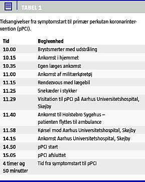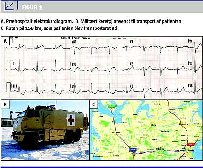 En 64-årig mand, der havde haft hypertension og sjældne anfaldsvise brystsmerter igennem tre år, fik torsdag den 7. januar 2010, kl. 10.00, voldsomme brystsmerter med udstråling til begge arme efter at have skovlet sne i en time på sin arbejdsplads. Den gennemsnitlige snedybde var 65 cm i patientens hjemby, Hvidbjerg ved Thyholm, og politiet frarådede al udkørsel pga. sne og snefygning med drivedannelse på over en meter. Patienten søgte hjem, og hans hustru ringede kl. 10.15 til egen læge, der straks alarmerede 112. Egen læge ankom til fods på patientens adresse kl. 10.35 og gav præhospital behandling med nitroglycerin og magnyl, anlagde venflon samt optog 12-afledningers-elektrokardiogram (ekg) (Figur 1 A). Pga. snemængderne disponerede alarmcentralen over et militærkøretøj, der var lokaliseret ved Falck i Hurup. Kl. 11.00 ankom militærkøretøjet til patientens hjem (Figur 1B) og fragtede egen læge og patienten gennem sneen til et rendezvous med lægebilen fra Holstebro. Lægebilen mødte den pansrede mandskabsvogn kl. 11.15, og ambulancelægen kørte med militærkøretøjet mod Holstebro. Kl. 11.29 modtog Herning Sygehus et telemedicinsk ekg fra ambulancen og videresendte dette til Aarhus Universitetshospital, Skejby, via GSM-nettet. Ekg'et viste ST-eleva-tioner i afledning I og afledninger, der tydede på et anteriorlateralt myokardieinfarkt.