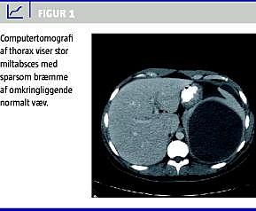 En 28-årig, tidligere rask, danskfødt mand med tyrkiske forældre blev set hos egen læge grundet intermitterende atraumatiske smerter i venstre skulder gennem flere måneder. Smerterne ændrede sig over tid til torakale smerter og siden til øvre abdominale smerter. Mere end et år efter symptomdebut fik patienten højfebrilia og blev indlagt akut. Ved indlæggelsen var patienten septisk, C-reaktivt protein var 241, der var leukocytose. En ultralydskanning af abdomen viste en cyste i milten. Behandling med albendazol, cefuroxim og metronidazol blev iværksat, og patienten blev overflyttet til en infektionsmedicinsk afdeling. Ved en computertomografi af abdomen fandt man en cyste/absces på 11 cm i diameter med en smal bræmme af normalt miltvæv omkring (Figur 1 ). En røntgenundersøgelse af thorax viste venstresidig pleural effusion med behov for drænage. Efter udelukkelse af amøbeabsces og ekinokokcyste med negativ indirect haemagglutination antibody (IHA)-titer og negative ekinokoktitre blev abscessen dræneret, og dyrkning viste Streptococcus anginosus . Abscessen blev initialt behandlet med antibiotika og drænage. Abscessen gendannedes, og nye kaviteter i milten tilkom. Disse blev også dræneret, men uden kurativ effekt. Patienten blev slutteligt splenektomeret efter forudgående pneumokokvaccination.