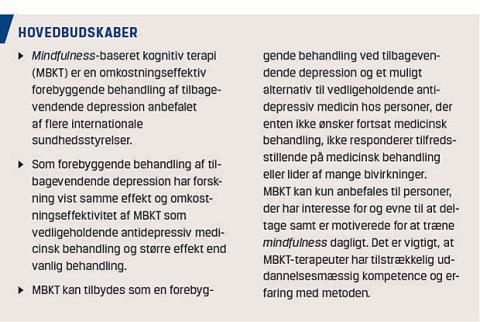 resultater for brug af MBKT til reduktion af depressive symptomer i et bredere spektrum af depressive lidelser. For eksempel fandt man i en RCT med 173 deltagere med behandlingsresistent depression, at de depressive symptomer blev reduceret signifikant mere hos MBKT-gruppen end hos en aktiv kontrolgruppe (Health Enhancement Programme), hvor der var tale om samme behandlingstid samt terapeut- og gruppekontakt [15]. Chiesa et al [16] fandt i en lille RCT med 43 deltagere, at blandt personer, der havde haft en eller flere depressive episoder og ikke responderede på behandling med antidepressiv medicin, var MBKT signifikant mere effektiv til reduktion af depressive symptomer både efter behandling og ved 26-ugers opfølgning end et otte ugers psykoedukationsprogram.