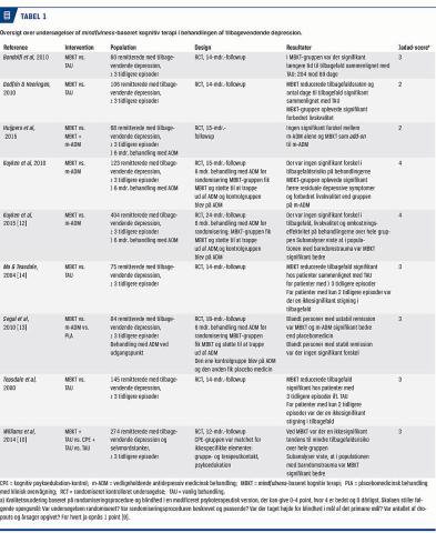 I den nyeste metaanalyse fra 2016 analyserede man ni RCT’er med 1.258 deltagere, der havde haft tre eller flere tidligere episoder af depression og var i fuld eller delvis remission [8]. I Tabel 1 vises en oversigt over de inkluderede studier. I metaanalysen fandt man, at MBKT gennemsnitligt reducerede risikoen for tilbagefald over 60 uger med 31% sammenlignet med risikoen for tilbagefald hos kontrolgrupper. Kontrolgrupperne blev behandlet med enten: vedligeholdende antidepressiva, et otteugers psykoedukationsprogram eller uspecificeret vanlig behandling (TAU). TAU kan være både psykoterapi, antidepressiva og ingen aktiv behandling.