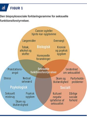 Seksuelle funktionsforstyrrelser skyldes ofte en kombination af biologiske, psykologiske og sociale faktorer og bør derfor forstås i den bio-psyko-sociale ramme (Figur 1). I Danmark diagnosticeres seksuelle funktionsforstyrrelser inden for både det psykiatriske og det somatiske område (Tabel 1), og behandlingen kan ske inden for flere specialer med praktiserende læger, urologer, gynækologer, psykiatere og psykologer som de hyppigste behandlere [1]. Seksuelle funktionsforstyrrelser kan også benævnes seksuelle problemer eller seksuelle dysfunktioner.