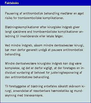 Formålet med nærværende artikel er at vurdere behovet for pausering af antitrombotisk behandling i forbindelse med mindre dentoalveolære kirurgiske indgreb (MDK). Ved MDK forstås i denne sammenhæng kirurgisk parodontalbehandling af 1-6 tænder, ekstraktion af 1-3 tænder, kirurgisk fjernelse af retineret rod eller tand, denudering af retineret tand, kirurgisk endodonti svarende til 1-2 tænder, indsættelse af enkelttandsimplantat uden sinusløftprocedure eller anden form for knoglegenopbygning, kirurgisk påsættelse af abutment på implantat, samt biopsitagning og fjernelse af mindre patologiske forandringer svarende til mundslimhinden.