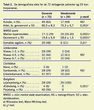 Der blev inkluderet i alt 101 personer, hvoraf de 29 var ikkedemente, 59 havde Alzheimers sygdom, otte havde demens af vaskulær type, mens fem havde andre specifikke demenstyper. Toogfirs deltagere (67 patienter og 15 kontrolpersoner) blev vurderet med MMSE ved andet besøg. Ved tredje besøg blev 90 genundersøgt, men to kunne ikke medvirke til hverken MMSE eller globalskalaer, hvorfor tredje besøg resulterede i 88 datasæt (61 patienter og 27 kontrolpersoner). Der var således 82 datasæt til analyse af test-retest-effekt og 189 datasæt til analyse af ROC og af korrelationer. De demografiske data for patienter og kontrolpersoner er gengivet i Tabel 2. Der var statistisk signifikant forskel på grupperne mht. alder og boligform, men ikke mht. køn, civilstand og uddannelsesniveau.