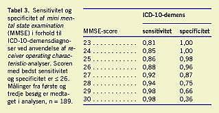 I Tabel 3 er vist resultatet af ROC-analyserne med MMSE versus ICD-10-diagnoser. Resultaterne af ROC-analyserne med MMSE versus CGI og GDS er ikke gengivet, idet uanset om man anvender ICD-10-diagnose, CGI-score > 1 eller GDS-score > 2, er en MMSE-score på 26 eller derunder den score, der i denne population bedst adskiller demente fra ikkedemente.