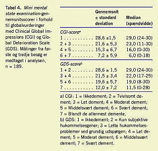 I Tabel 4 illustreres MMSE's anvendelighed til at inddele populationen med i sværhedsgrad i forhold til globalvurderingerne ved CGI og til GDS med angivelse af gennemsnitsværdier og standardafvigelser samt medianværdi og spændvidde. Det ses, at der er betydelig spredning af MMSE-score uanset sværhedsgrad. I en tilsvarende analyse for de 59 personer med Alzheimers demens er der også en betydelig spredning af sumscore. Medianscore og spændvidde for CGI-gruppe 2 og 3 er 23 (11-29), for CGI-gruppe 4 og 5 er den 16 (0-30) og for gruppe 6 og 7 er den 6 (0-18). Analysen for GDS viser tilsvarende resultater (data ikke vist).