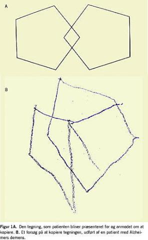 Man har hidtil i Danmark anvendt en skæringsscore på ≤ 24 [1, 6] som værende bedst til at skelne de demente fra de ikkedemente personer med, men baseret på denne undersøgelse er ≤ 26 en mere korrekt skæringsværdi. Den undersøgte population kan ikk e siges at være repræsentativ for almenbefolkningen over 64 år. Der er tale om en udvalgt population, der dog efter vores mening må anses for at være dækkende for størstedelen af de ældre, der i sygehusregi og i almen praksis udredes for demens. Det må dog fremhæves, at MMSE ikke er velegnet til patienter med frontotemporal demens, da denne type demens bl.a. er kendetegnet ved først ret sent i demensforløbet at give dysfunktion i hukommelse, orientering og visuospatiel evne, og en af MMSE's oplagte svagheder er, at den helt overvejende koncentrerer sig om disse kognitive domæner, mens områder som f.eks. abstrakt tankegang og semantisk viden ikke indgår. Figur 1 viser et eksempel på forstyrret visuospatiel funktion hos en patient med Alzheimers demens. Selv om det fremgår af de i Tabel 3 angivne værdier for sensitivitet og specificitet, at antallet af falsk positive og falsk negative værdier ikke nødvendigvist er stort, må det fremhæves, at en MMSE-score > 26 ikke udelukker demens, ligesom en score ≤ 26 heller ikke med sikkerhed godtgør tilstedeværelsen af en demenssygdom. Dette understreger, at en MMSE-score aldrig kan stå alene, og at en nøje anamnese fra såvel pårørende som patient er meget væsentlig.