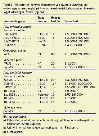 Leukæmi opdeles traditionelt i akut eller kronisk, samt i lymfatisk eller myeloid. Mens den genetiske baggrund for den kronisk lymfatiske (CLL) hænger sammen med og til en vis grad udgår fra den leukæmiske celles B-celle-tilknytning, gælder for de tre andre, akut myeloid (AML), akut lymfatisk (ALL) og kronisk myeloid (CML), at der ofte er balancerede translokationer bag deres oprindelse. Ved balanceret translokation forstås en ombytning af kromosommateriale, der er uden samtidigt tab, og som går igen i alle den immortaliserede celles datterceller [1]. Et klassisk eksempel på en balanceret translokation er Philadelphiakromosomet. Her giver det fusionerede DNA på kromosom 22 anledning til et ribonukleinsyre (RNA)-fusionstranskript, der medfører dannelse af en abnormt fungerende tyrosinkinase, der giver cellerne en vækstfordel (se oversigt i [2]). Mens næsten alle CML-patienter bærer denne forandring i deres celler, gælder for ALL og AML, at de er betydeligt mere komplicerede i deres genetiske konstitution, og at kun en del af patienterne har påviselige translokationer (Tabel 1 ). Til gengæld findes ved både AML og ALL en række andre forandringer, som kan anvendes til diagnostik af den maligne klon [3]. Som det også fremgår af Tabel 1, er der tale om såvel genduplikationer som punktmutationer, og når dertil lægges, at en række gener, der ikke er ændrede, overudtrykkes i de maligne celler i forhold til de benigne, kan det uddrages, at langt de fleste patienter med akut og kronisk leukæmi har en anvendelig genetisk markør.