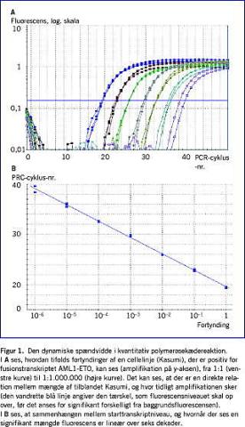 Ved PCR opnår man en eksponentiel tilvækst af kopier af en konkret nukleinsyresekvens. Mens resultatet af en standard-PCR er et positivt eller negativt svar, blev det i 1990'erne med en ny fluorescensbaseret metode muligt løbende at kvantificere PCR-produkterne for hver enkelt cyklus i amplifikationsforløbet [5]. I apparatur, der er udviklet specielt til metoden, måles tilvæksten af produktet for hver enkelt PCR-cyklus som en tilvækst af fluorescens, og det kvantitative aspekt indgår derved, at jo før et bestemt produkt giver anledning til et fastsat tærskelniveau af fluorescens, jo flere kopier var der af nukleotidsekvensen fra starten (Figur 1A ). På denne måde kan tærskelværdier for opformering af produkter (f.eks. fusionstranskripter, dvs. sammensmeltningen på RNA-niveau af produkter fra to forskellige gener) anvendes som grundlag for beregning af MRD. Et kendetegn for teknikken er, at der for hver biologisk prøve tages hensyn til opformering af en række gener, der er ensartet til stede i alle humane celler (såkaldte »husholdningsgener«). Sidstnævnte fungerer også som intern kvalitetskontrol for analysen, idet sen opformering er ensbetydende med dårligt prøvemateriale og dermed også nedsat følsomhed af MRD-bestemmelsen i den pågældende prøve [6]. På denne måde vil hver patientprøve således have sin egen interne kontrol, hvilket er af stor betydning ved fortolkningen af den enkelte prøve.