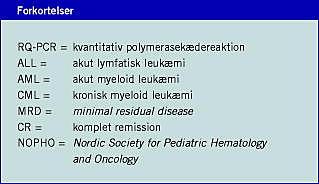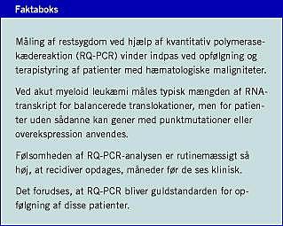 I en ledsagende artikel har vi redegjort for, at der ved en række hæmatologiske maligniteter ses genforandringer, der kan måles med kvantitativ polymerasekædereaktion (RQ-PCR). Denne teknik har de seneste år været igennem en præklinisk validering i multicenterregi, der har godtgjort, at den er klar til overførsel til den kliniske hverdag.