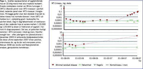 Som nævnt er det kun under halvdelen af alle AML-patienter, der bærer en balanceret translokation i deres celler, hvilket på sin side indebærer, at der ikke for nærværende er fusionstranskript-assays for de resterende patienter. En væsentlig del af disse har dog vist sig at have en punktmutation i NPM1 -genet, som koder et kernetransportprotein, der på grund af mutationen displaceres fra kernen til cytoplasmaet [6]. Dette gen er så højt udtrykt, at præliminære undersøgelser tyder på, at det - til trods for, at det kun er en punktmutation - kan anvendes som en MRD-markør. Ydermere har det vist sig, at Wilms tumorgen 1 (WT1) er overudtrykt blandt andet ved myeloide maligniteter og kan anvendes som MRD-markør [7]. Da sidstnævnte således ikke er et ændret gen, skal ekspression i en patient ses på baggrund af niveauet hos normale donorer [8]. På trods af dette har internationale erfaringer med WT1 været positive, og det har endog vist sig, at dets udtryk kan anvendes til at adskille patienter i høj og lav risiko, selv hos patienter der har opnået første CR. Med andre ord kan denne MRD-bestemmelse stratificere patienter i klinisk remission på et meget tidligt tidspunkt [4]. Et typisk eksempel på anvendelse af WT1 til sygdomsopfølgning ses på Figur 1 .