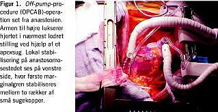 Anvendelsen af HLM med kanylering af aorta og standsning/køling af hjertet er en betydelig del af det kirurgiske traume, som medfører et diffust inflammatorisk respons med risiko for større postoperative cerebrale, kardiale, renale, gastrointestionale og koagulationsmæssige komplikationer, som ses hos 5-8% af patienterne efter bypasskirurgi. Denne komplikationsfrekvens kan muligvis reduceres ved OPCAB-teknikken, som blev introduceret for 6-7 år siden. Kanylering af aorta undgås, hjertet slår og garanterer den hæmodynamiske stabilitet, mens der foretages en fokal stabilisering under udførelsen af anastomoserne (Figur 1 ).