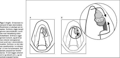 Resektionsteknikken ved lasermikrokirurgi adskiller sig fra resektionsteknikken ved konventionel kirurgi, hvor man fjerner tumoren en bloc. Ved lasermikrokirurgi er det nødvendigt for de store tumorers vedkommende at lægge snit gennem disse, således at de fjernes stykke for stykke efter en i forvejen fastlagt plan, mens små tumorer kan fjernes en bloc (Figur 1 ). Grundet den specielle laserteknik og den forstørrelse samt det gode lys, som mikroskopet afgiver, er man klinisk oftest i stand til at afgøre, om vævet er sundt. Denne opfattelse underbygges af frysemikroskopi, idet fjernet væv sendes til histologisk undersøgelse i orienteret stand, og man får verificeret, om vævet er sundt.