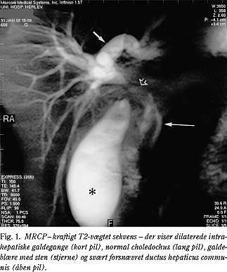 Pga. stigende leverenzymer blev der udført en MR-scanning med MR-cholangio-pankreatikografi (MRCP) fem dage efter UL-scanningen. MR-scanningen viste en snæver striktur på DHC (Fig. 1 ) pga. kompression fra bløddelsfylde i porta hepatis samt indkilet sten i collum. Der var betydelig intrahepatisk galdestase, men choledochus var normal. Galdeblæren indeholdt multiple sten og var omgivet af fri væske. En åben kolecystektomi bekræftede MR-diagnosen Mirizzis syndrom. Man fandt galdeblæren pusholdig med en sten indkilet i collum og omgivet af svære inflammatoriske forandringer, som forårsagede kompressionen af DHC. Via koledokotomi fandtes strikturen i DHC eftergivelig. Der var ingen fistel mellem galdeblæren og choledochus.