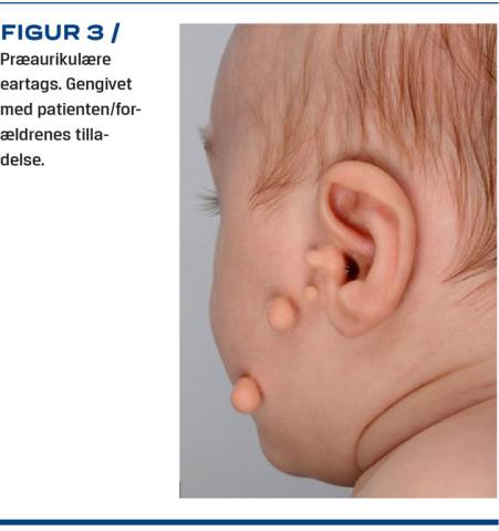 Aurikulære vedhæng, også kaldt accessoriske tragi, kan forekomme i et triangulært område mellem aurikel og mundvige (Figur 3) [5, 16]. De menes at være forårsaget af manglende fusion af de mesenkymale fortykkelser på første brankiebue [16]. Forekomsten er 1-5 pr. 1.000 nyfødte. Hvis vedhænget har en smal base og kun indeholder hud, kan det fjernes ved enten ligation eller excision i de første leveuger. Hvis det drejer sig om et bredbaset vedhæng, eller hvis det indeholder brusk, bør det excideres enten i fuld bedøvelse efter toårsalderen af plastikkirurg, alternativt når barnet kan samarbejde til operation i lokalbedøvelse. Behandlingen er udelukkende kosmetisk. Især ved multiple vedhæng bør man være opmærksom på tegn på andre misdannelser [17]. Hvis der er tale om vedhæng i forbindelse med en mikroti, bør man afholde sig fra excision, indtil barnet er vurderet af en mikrotikyndig plastikkirurg.