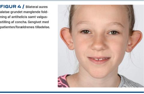 Aures alatae, som ofte bliver nævnt, når man taler om øredeformiteter, kan også betegnes som en anatomisk variant (Figur 4). Der er også et kulturelt aspekt i, hvornår strittende ører ses som en deformitet, f.eks. finder man det mange steder i Asien attraktivt med udstående ører [18]. Aures alatae forekommer hos 5-10% af verdens befolkning og defineres ofte som afstand fra mastoidet til den mest prominerende del af helixkanten på over 20-25 mm, men operationsindikationen varierer mellem afdelinger og er oftest en individuel vurdering [2, 19]. Ører kan opfattes som »strittende«, hvis der er manglende foldning af antihelix, hypertrofi af concha eller valgusstilling af concha. Ofte er årsagen til aures alatae en kombination af disse, og valg af behandling afgøres af de individuelle forhold.